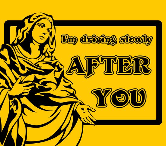聖母マリアが後続車に安全運転のメッセージを伝えます。